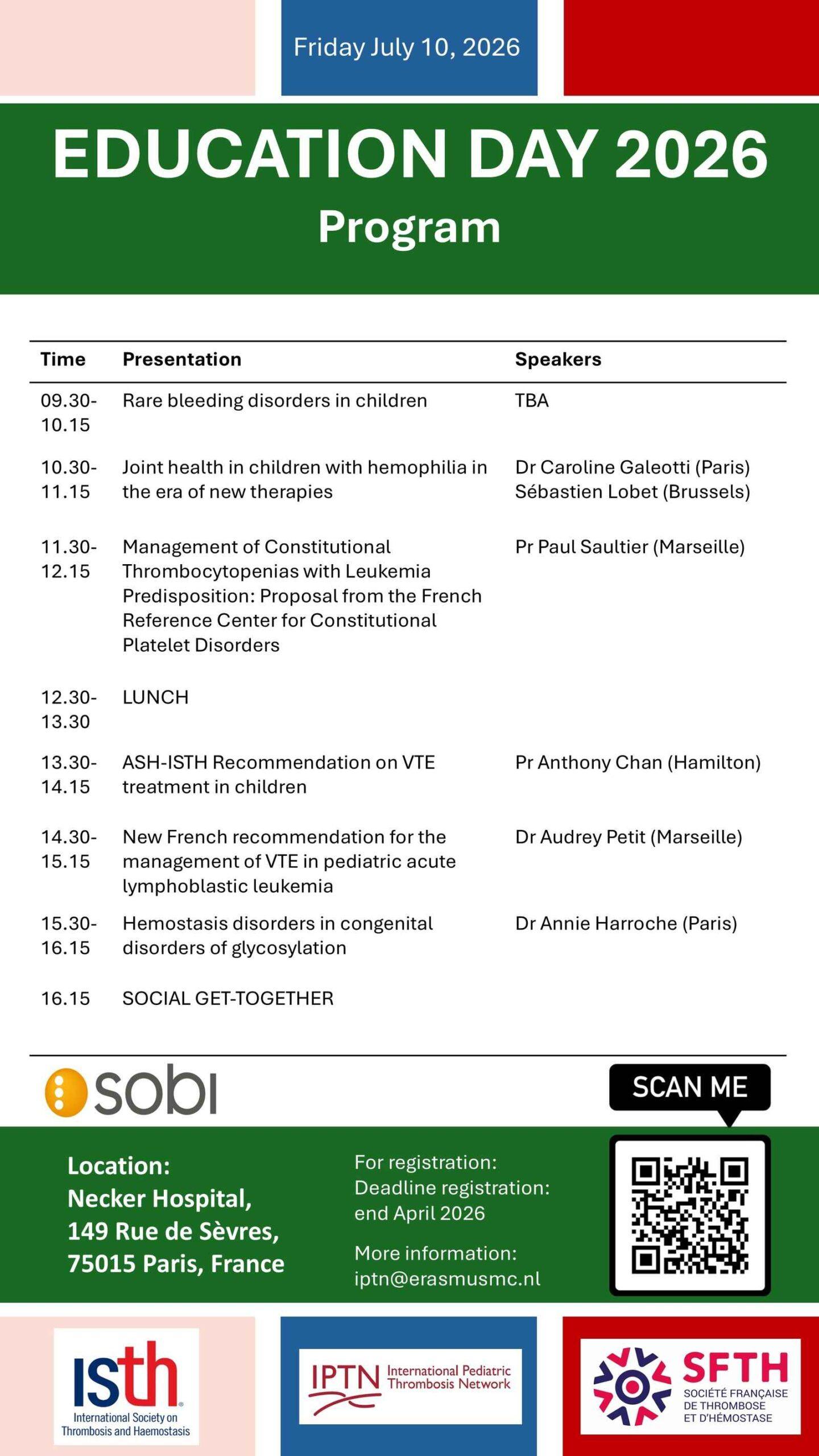 We are pleased to invite you to the Pediatric Hemostasis Education Day, which will take place on Friday, July 10, 2026, in Paris, at Necker Hospital, one day prior to the ISTH 2026 Congress.